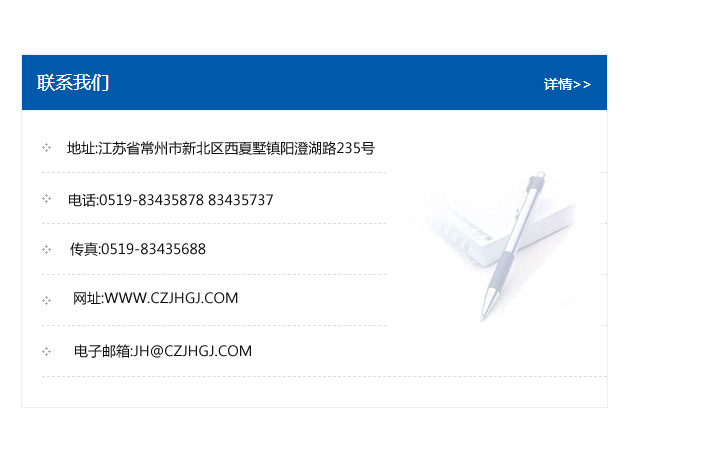 地址:常州市新北區友邦商務大廈1幢16、17層  電話:0519-85101652  傳真:0519-85112595  郵編:213022  網址:www_cz-jiayue_cn.jilvw.com  郵箱:xiajifengaa@163.com